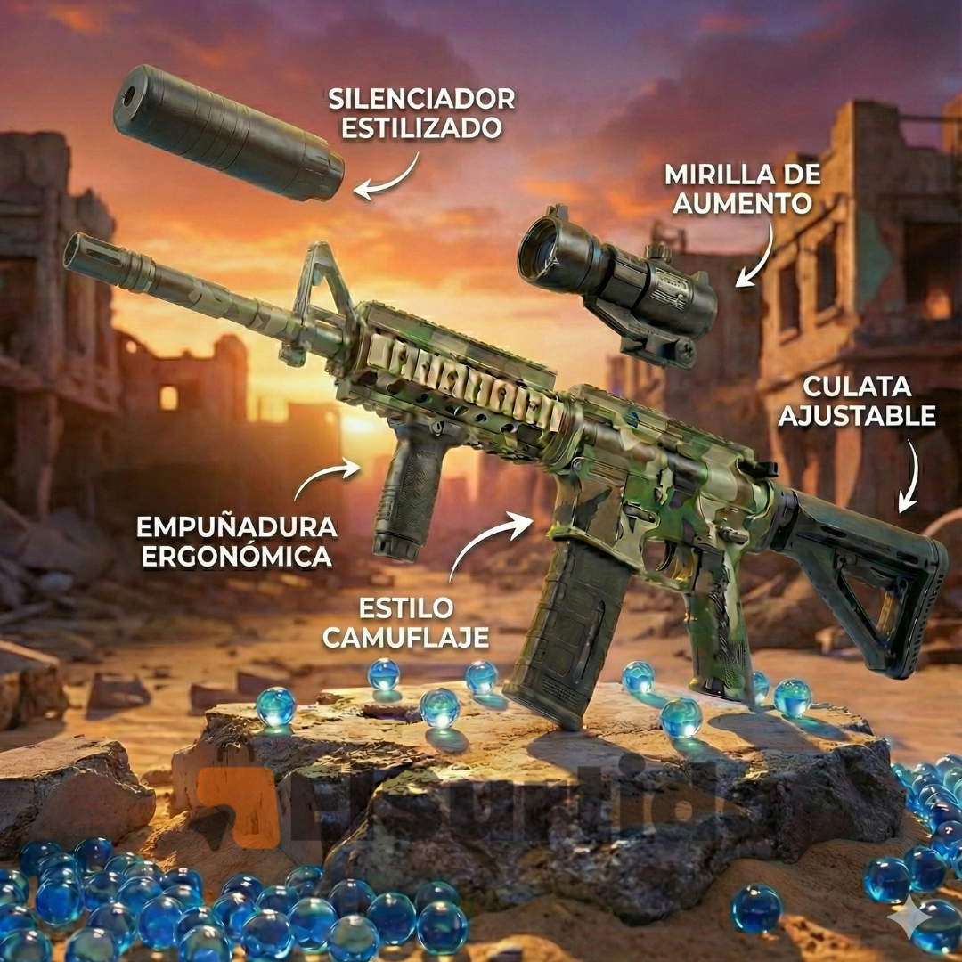 ✅ DIVERSIÓN SIN LÍMITES NI DESORDEN: Utiliza munición de Hidrogel (7-8mm). Son balines de agua seguros, ecológicos y ligeros que estallan al impacto y se evaporan. ¡Cero manchas, cero basura, 100% adrenalina!